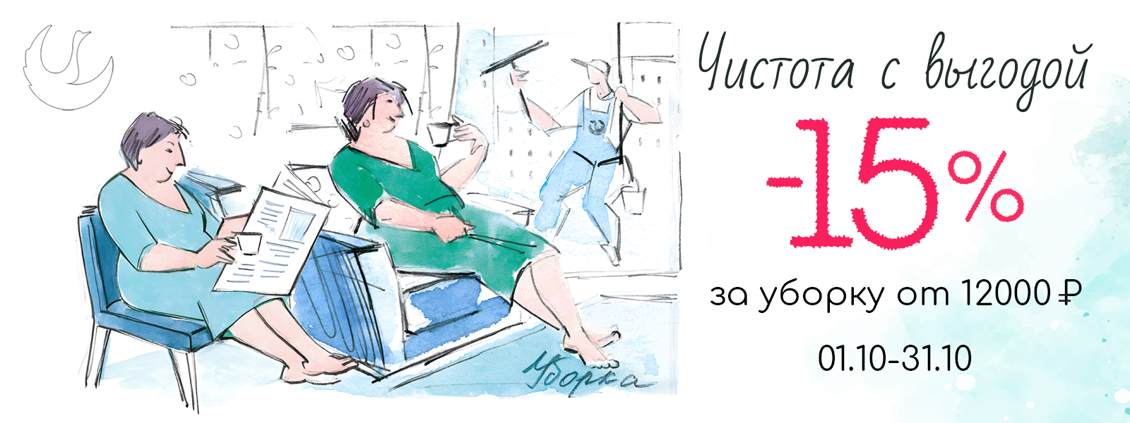 Условия акции: Скидка 15% при заказе уборки квартир/домов/офисов на сумму от 12 000 руб.