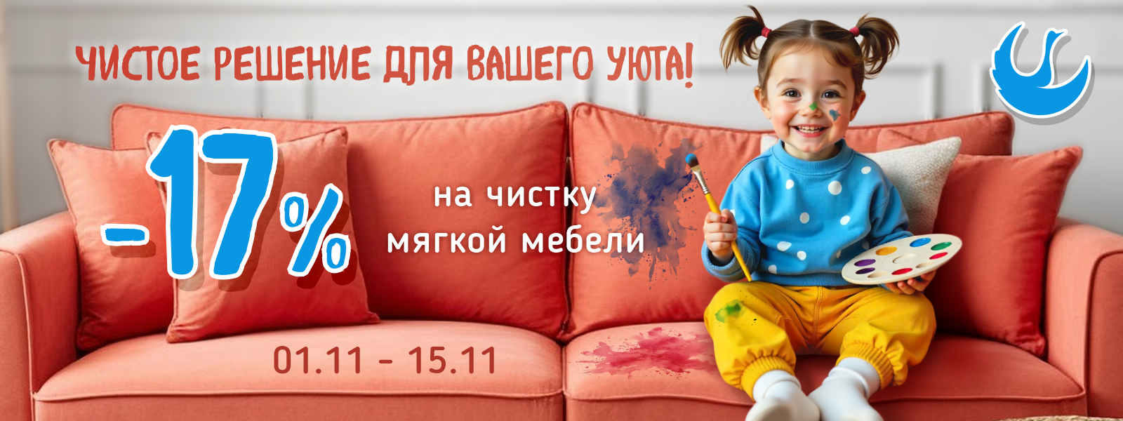 Условия акции: Скидка 17% при заказе химчистки мягкой мебели на дому или загородном доме.